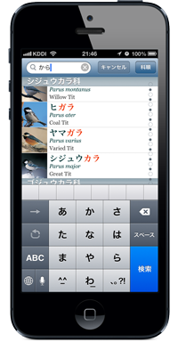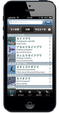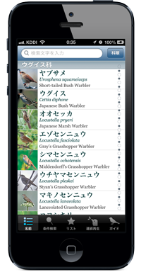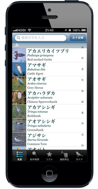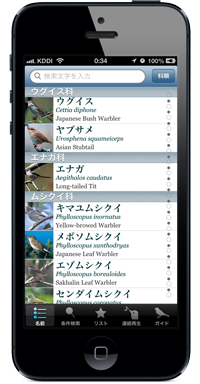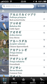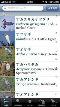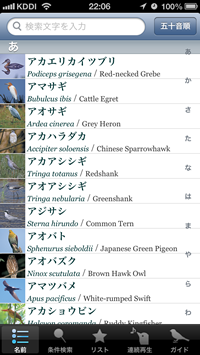 気になる野鳥がいたら、すぐに調べてみましょう。五十音順、科順の一覧から選ぶことも、学名や英名、野鳥の名前などの文字で検索することもできます。