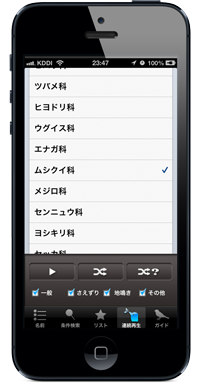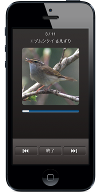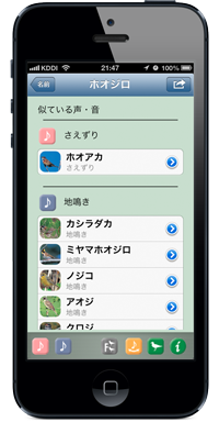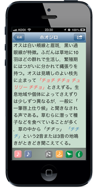 再生ボタンまたは鳴き声の表音(カタカナ)文字をタップすると鳴き声が再生されます。