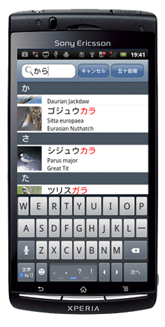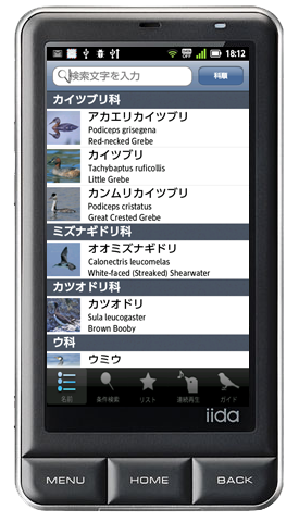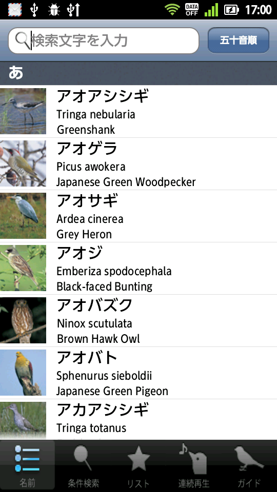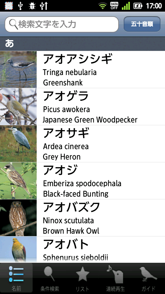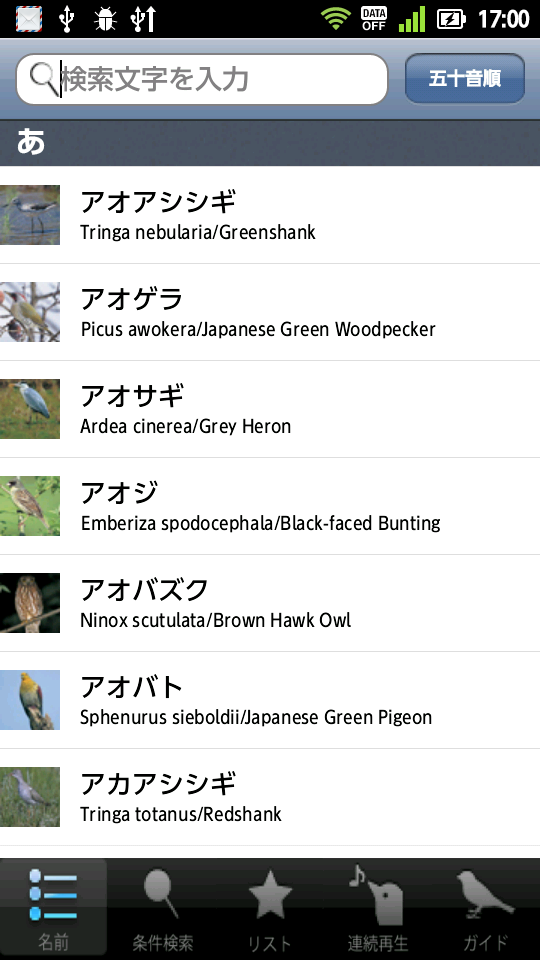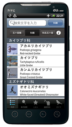 気になる野鳥がいたら、すぐに調べてみましょう。五十音順、科順の一覧から選ぶことも、学名や英名、野鳥の名前などの文字で検索することもできます。