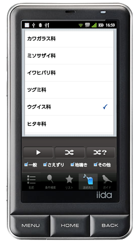 ご自分で作成されたリストや、選択した科の鳴き声を連続再生することもできます。好きな鳴き声を集めて鑑賞するも良し、ブラインドモードにして再生すれば鳴き声に耳を慣らすトレーニングにも活用できます。