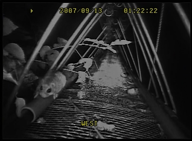 深夜に現れたヤマネ(左下)。つかまっているのは通信ケーブル用のパイプ。(画像クリックで拡大)